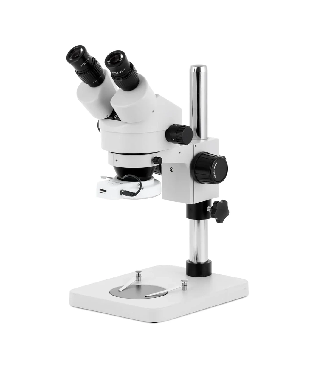 The AmScope SM-1B Series Binocular Stereo Microscope 7X–45X is a versatile and reliable tool designed for detailed inspection and hands-on work that requires depth perception and clarity. Featuring a smooth zoom range from 7X to 45X, it allows users to quickly adjust magnification without losing focus, making it ideal for laboratories, classrooms, electronics repair, watchmaking, and biological dissection.